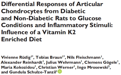Rüdig V, Braun T, Fleischmann N, Reinhardt A, Wehrmann J, Gögele C, Kokozidou M, Werner C, Mrosewski I, Schulze-Tanzil G. Differential Responses of Articular Chondro cytes from Diabetic and Non-Diabetic Rats to Glucose Conditions and Inflammatory Stimuli: Influence of a Vitamin K2 Enriched Diet. Cartilage. 2025 Mar 21:194 76035251317091. doi: 10.1177/19476035251317091.