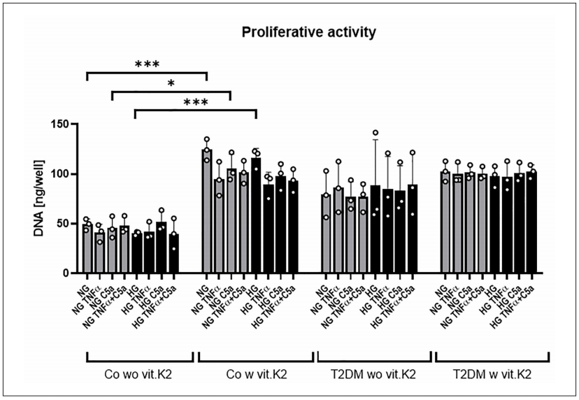 基于DNA量来表达关节软骨细胞增殖率:喂食维生素K2的非糖尿病对照大鼠(Co w vit.K2)明显高于未喂食维生素K2的非糖尿病对照大鼠(Co wo vit.K2);维生素K2对糖尿病大鼠软骨细胞增殖率无明显影响。p≤0.05;***p≤0.001