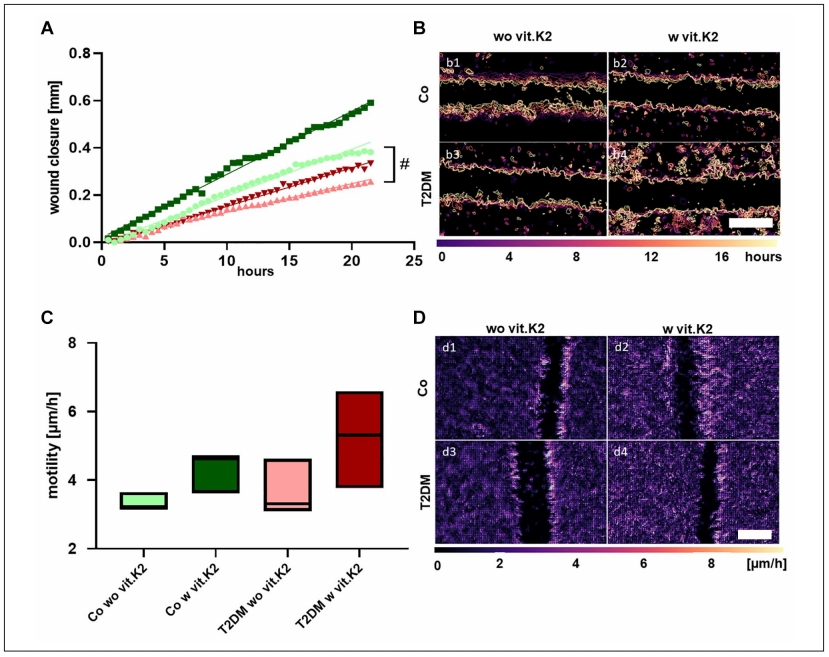采用软骨细胞迁移与运动来测试伤口愈合能力。20小时后,补充维生素K2两组伤口闭合速度和运动能力都快于未补充维生素K2两组。