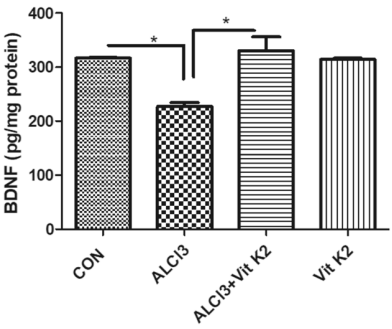 氯化铝处理后,大脑中的BDNF浓度明显降低(p<0.05)。维生素K2给药明显增加(p<0.05)。