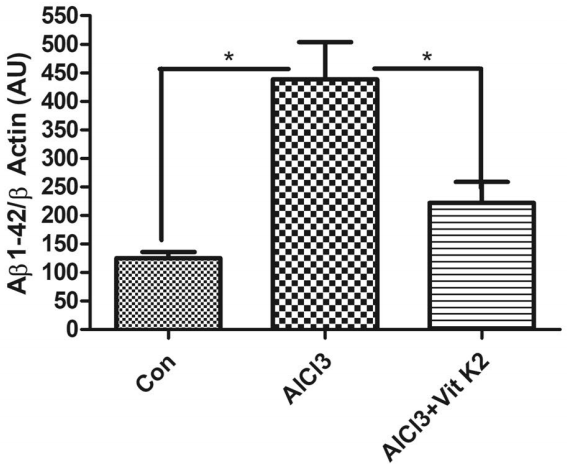 氯化铝处理后,大脑中的β-淀粉样蛋白活性增强(p<0.05)。维生素K2给药明显降低了氯化铝处理动物的β-淀粉样蛋白活性(p<0.05)。
